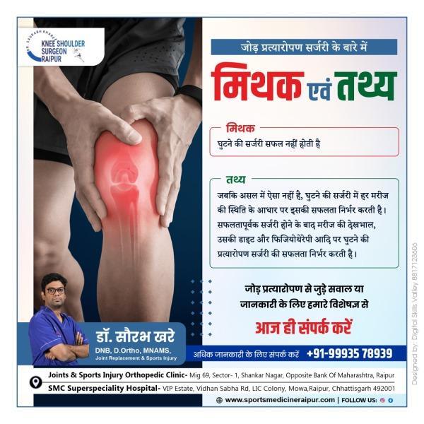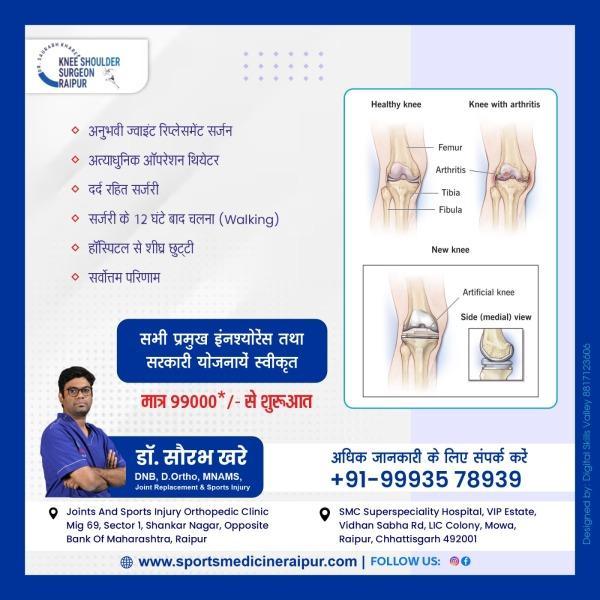 Best Joint Replacement Doctor I Arthroplasty Doctor I Best ACL Surgery I Ligament Surgery I ACL I Sports Surgeon I Best ACL Surgeon I ACL Doctor I Best Knee Surgeon I Best Shoulder Surgeon I Best Arthroscopic Doctor I Ligament Injury I Top ACL Surgeon I Shoulder dislocation Treatment I MPFL Tear I Total Knee Replacement I Total Hip Replacement I Best Orthopedic Doctor I Best Orthopaedic doctor I Dr. Saurabh Khare is an experienced Orthopedic Surgeon who has been practicing in Raipur. His fields of interest are Joint replacement surgeries and minimally invasive Arthroscopic surgeries. Dr Khare works closely with his patients to ensure they receive the best possible care and offers personalized treatments tailored to each individual's needs.