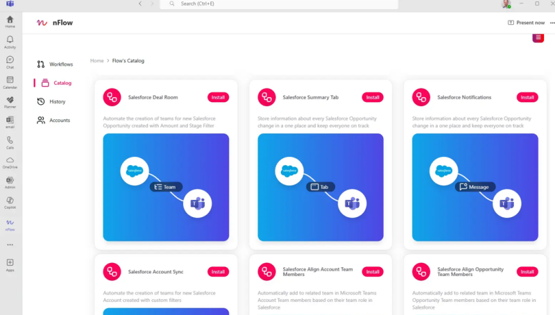 nFlow is the missing Salesforce integration for Microsoft Teams. It connects CRM data with day-to-day collaboration so sales and service teams can actually work where conversations happen. It gives your Salesforce data a permanent and collaborative presence within the Microsoft Teams ecosystem. Every record becomes an active workspace where files, tasks, and conversations are organized in one place. This visibility ensures that all team members have the context they need to contribute effectively to a project. Smart alerts and pinned records prevent the fragmentation of information that often occurs across different tools. The result is a more cohesive team environment where data drives every interaction. nFlow transforms how your organization interacts with its most valuable customer information.