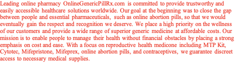 Leading online pharmacy OnlineGenericPillRx.com is committed to provide trustworthy and easily accessible healthcare solutions worldwide. Our goal at the beginning was to close the gap between people and essential pharmaceuticals, such as online abortion pills, so that we would eventually gain the respect and recognition we deserve. We place a high priority on the wellness of our customers and provide a wide range of superior generic medicine at affordable costs. Our mission is to enable people to manage their health without financial obstacles by placing a strong emphasis on cost and ease. With a focus on reproductive health medicone including MTP Kit, Cytotec, Mifepristone, Mifeprex, online abortion pills, and contraceptives, we guarantee discreet access to necessary medical supplies.