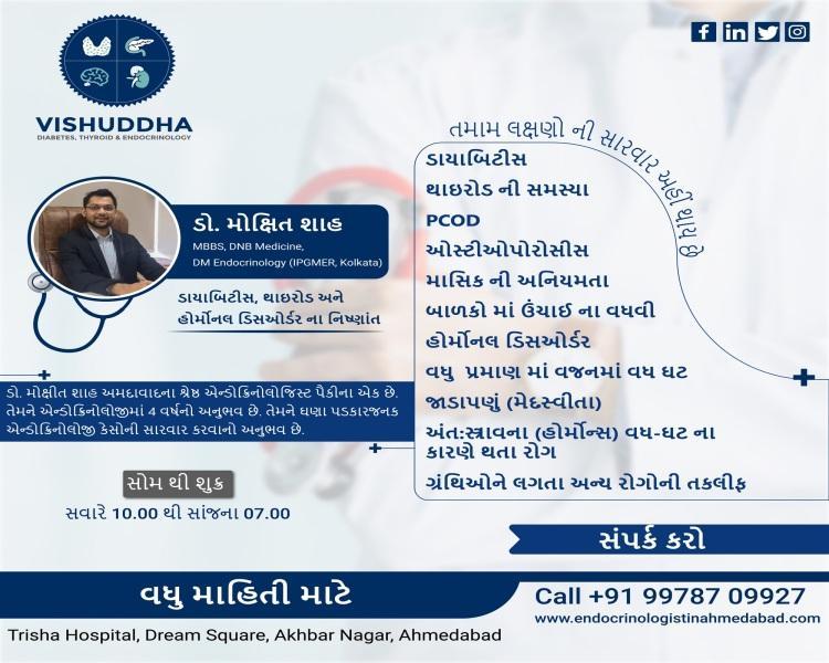 Vishuddha Diabetes Thyroid & Endocrinology Clinic, where your health takes center stage. Led by the esteemed Dr. Moxit Shah, recognized as the best endocrinologist and Diabetes Doctor in Ahmedabad, our clinic is dedicated to providing comprehensive endocrinology care. We offer a wide range of services, including expert management of diabetes, both type 1 and type 2, neuro endocrine care, reproductive endocrinology, specialized diabetic eye care, thyroid health services, and expert care from our pediatric endocrinologist. With a patient-centered approach and a commitment to empowering individuals, Dr. Shah ensures personalized treatment plans tailored to your unique needs. Trust Dr. Moxit Shah to be your partner in wellness, guiding you towards a healthier, happier life. At Vishuddha, your well-being is our priority.