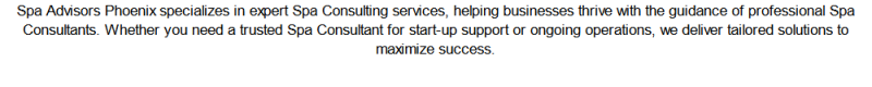 Spa Advisors Phoenix specializes in expert Spa Consulting services, helping businesses thrive with the guidance of professional Spa Consultants. Whether you need a trusted Spa Consultant for start-up support or ongoing operations, we deliver tailored solutions to maximize success. Visit us at 16403 S Mountain Stone Trail, Phoenix, AZ 85048, call us at (480) 460-7727.