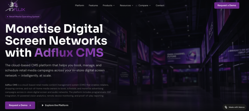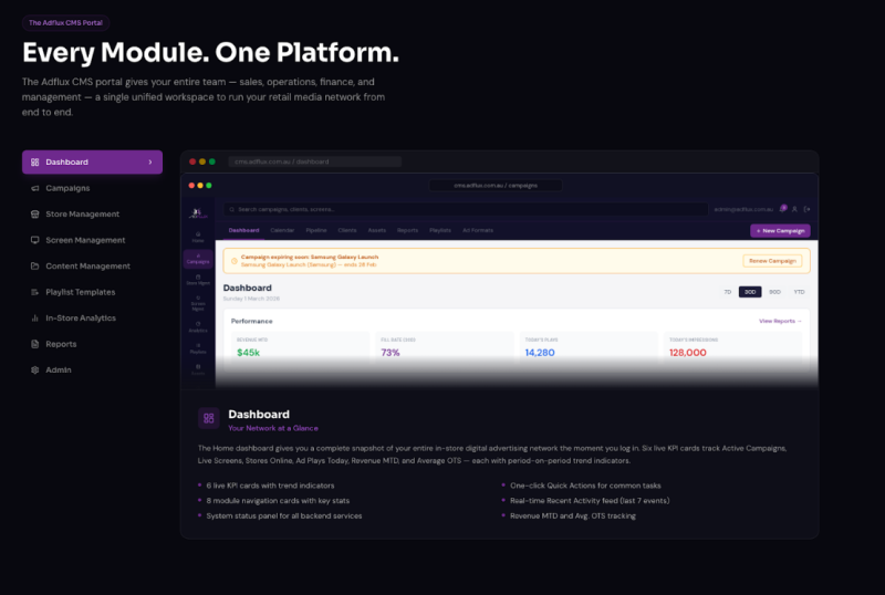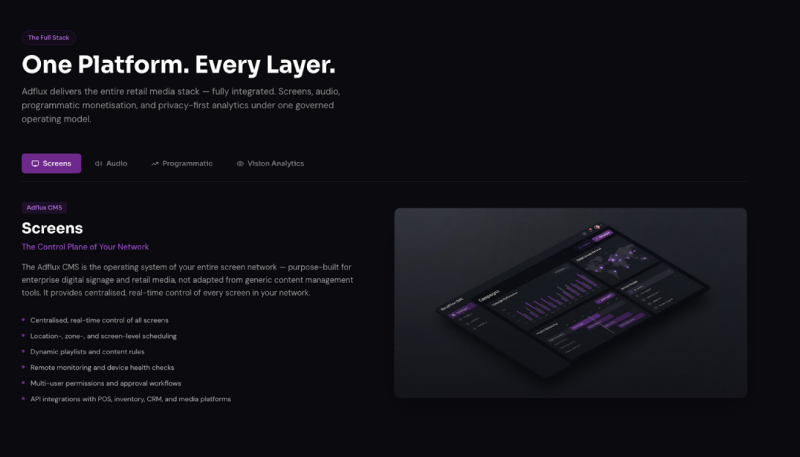 Adflux CMS is a cloud-based retail media platform that empowers retailers and media owners to efficiently manage, deliver, and monetise advertising across in-store digital screens and audio networks. It provides a centralised system for campaign scheduling, content distribution, and performance tracking, while integrating with programmatic SSPs for expanded demand. With AI-powered insights, remote device monitoring, and proof-of-play reporting, Adflux CMS delivers the transparency, automation, and scalability needed to optimise retail media operations and drive sustainable revenue growth.