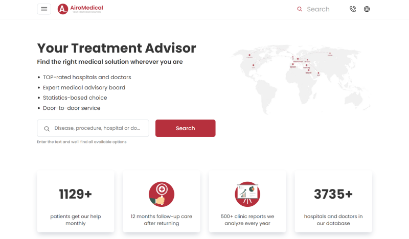 AiroMedical is a healthcare marketplace - a bridge between TOP-rated hospitals, doctors, and patients. We help you access and book leading specialists in the best clinics at an affordable rate. Our platform has a current database of 3,735+ clinics and doctors in countries with leading healthcare, such as Germany, Israel, Poland, Spain, Turkey, etc. We do not stick to certain providers; we are constantly searching and ensuring the best medical solution for each case.