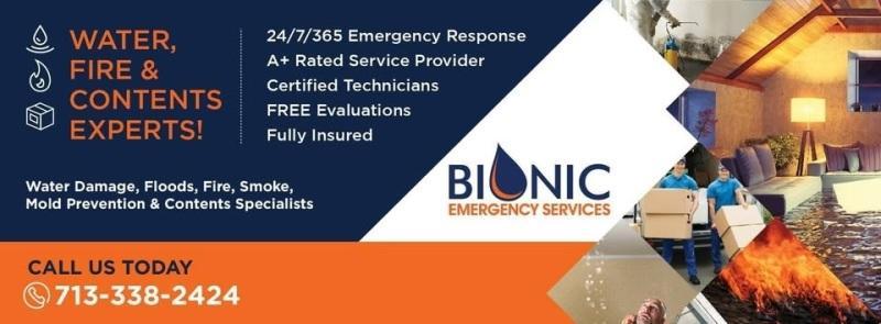 BIONIC Emergency Services in Houston offers 24/7 emergency water damage repair, flood cleanup, and mold remediation services across Houston and surrounding areas. Our IICRC-certified technicians utilize advanced drying and extraction equipment to restore residential and commercial properties swiftly and efficiently. We handle everything from burst pipes and storm damage to sewage backups, ensuring your property is returned to its pre-loss condition. Trusted by homeowners and businesses alike, we work directly with all major insurance providers to streamline your recovery process. Call 713-338-2424.