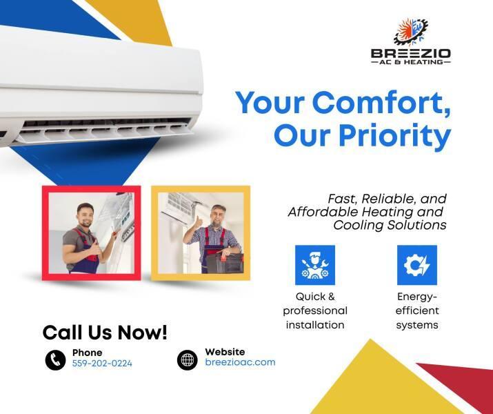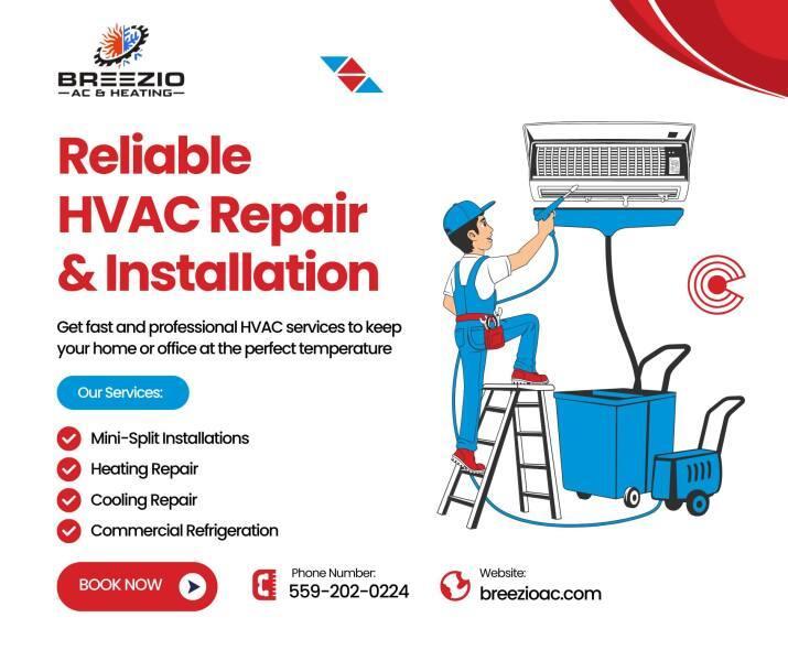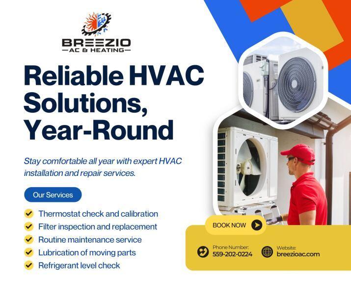 Breezio AC & Heating is a top-rated HVAC contractor based in Visalia, CA, serving the Central Valley and surrounding communities including Tulare, Hanford, Fresno, and Porterville. With over 30 years of hands-on experience, their licensed and insured technicians specialize in high-efficiency solutions such as air conditioning installation, furnace repair, heat pump maintenance, and ductless mini-split systems. Dedicated to providing a 5-star experience, they offer 24/7 emergency service, flexible financing, and a two-year maintenance plan with every new installation to ensure long-term comfort for residential and commercial clients. Breezio AC & Heating is located in Visalia, CA, and can be reached at (559) 202-0224 or online at https://breezioac.com/ for all professional heating, cooling, and air duct needs.
