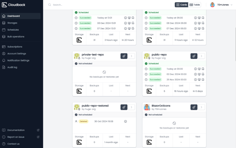 Cloudback is a powerful, automated backup solution built to protect your GitHub repositories, including both code and essential project metadata. Whether you're an individual developer, part of a team, or managing repositories for an enterprise, Cloudback offers seamless integration to ensure your repositories are securely backed up and can be quickly restored when needed.