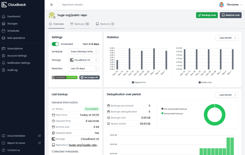 Rapid Recovery: Cloudback streamlines disaster recovery with fast restore options, allowing you to quickly recover your repositories and metadata in the event of accidental deletion or loss.