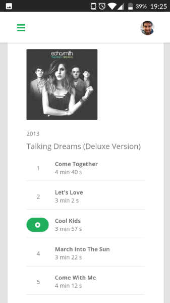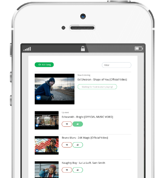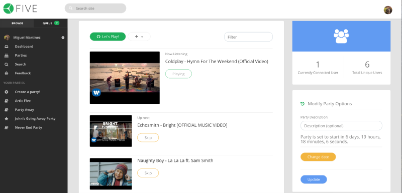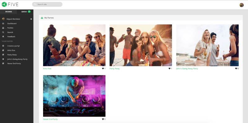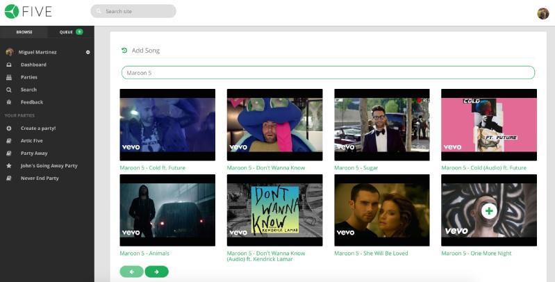 Five is a music platform to collaboratively create playlists among all the participants of a party or social event. This can range from a small get-together with friends, to a birthday party, or even a radio station wanting to give control to their listeners. There shouldn't be a need to prepare a music playlist before an event that might or might not resonate with everyone. Five's main focus is to provide a collaborative platform where everyone can add their favorite songs, and then allow people to vote for them in real time.