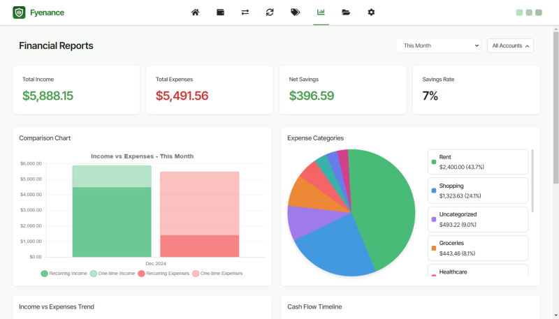 Smart Dashboard: Offers immediate insights into spending habits, income patterns, and financial goals.