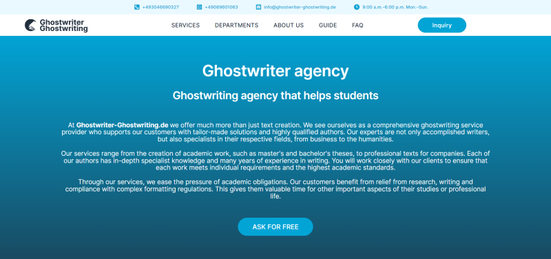 Ghostwriter Ghostwriting is a leading provider of professional ghostwriting services for academic, business, and personal writing in Germany. With a dedicated team of experienced writers, we offer customized solutions tailored to our client's individual needs and goals. Whether writing academic papers, drafting business plans, or composing personal documents, our services are designed to meet the highest quality standards and exceed our clients' expectations. With a strong emphasis on discretion and a deep understanding of the importance of originality and authenticity in writing, Ghostwriter Ghostwriting represents excellent, client-tailored text solutions in the German language.