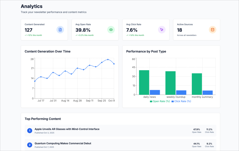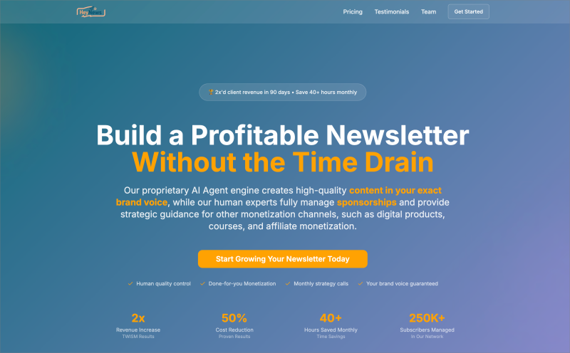 Our clients experience measurable results: 300% ROI increase, 50% cost reduction, doubled revenue, and save 40+ hours monthly. We serve newsletter operators from solo creators to established publishers with 100K+ subscribers.