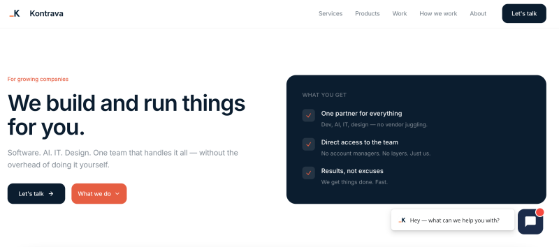 Growing companies often have strong teams but fragmented execution. Different vendors handle software, AI, IT, and go-to-market, creating silos and delays. Kontrava replaces this complexity with a single, integrated delivery partner. One team owns the full execution lifecycle and understands your business end to end. When priorities shift or new needs appear, we expand scope instead of handing you off. AI accelerates repetitive and operational work so progress never stalls. Experienced professionals focus on strategy, quality, and critical decisions. The result is faster execution with clarity, accountability, and control.