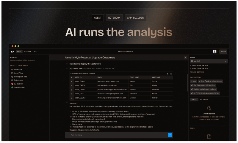 Livedocs automatically analyzes your data, generates charts and metrics, applies statistical models and machine learning where needed, and even writes queries or code behind the scenes. It’s like having an entire data science team available on demand.