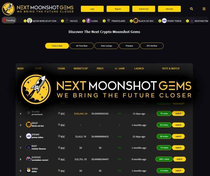 Next Moonshot Gems is an advertising, Promotion and voting platform where newly released coins are discovered, explored and ranked by voting