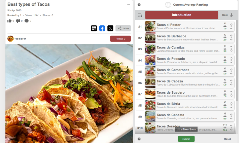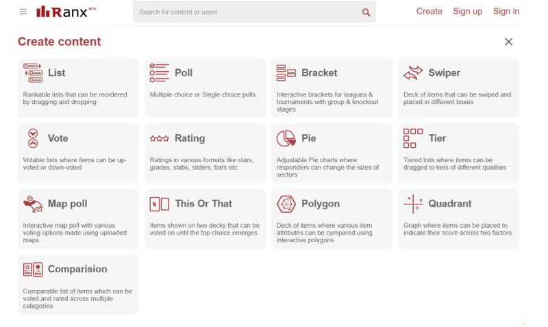 Ranx is an AI-enabled online social platform for crowdsourcing, aggregating and analyzing opinion data gathered from user-generated multimedia-rich snap surveys. Ranx supports survey tools such as rankable lists, single and multi-choice polls, votable lists, pie charts, tiered lists, map polls, tournament-style brackets, swipeable decks for sorting, quadrant graphs for two-factor preferences, polygon charts to compare attributes and rating systems like stars, grades, and sliders. Ranx allows users to host and share surveys and responses on social media and embed them on websites, emails and applications. Users can analyze data using our AI assistant RAIA and our comprehensive data analytics and visualization tools. We are a social platform where you can follow creators, comment on their surveys, suggest improvements and get notified about new content and updates. Ranx works seamlessly across smartphones, tablets, and desktops and is available on the web on ranx.com and soon on the iOS App Store and Google Play Store.