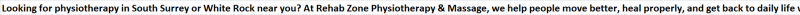 Looking for physiotherapy in South Surrey or White Rock near you? At Rehab Zone Physiotherapy & Massage, we help people move better, heal properly, and get back to daily life without constant pain. Our licensed physiotherapists and registered massage therapists treat sports injuries, work injuries, post-surgery recovery, and everyday aches. Book today with a physiotherapy clinic near you that makes recovery less stressful.