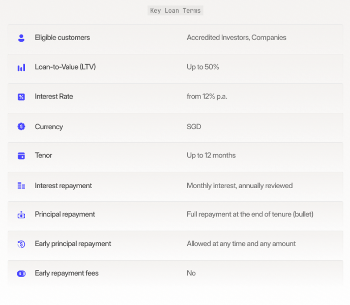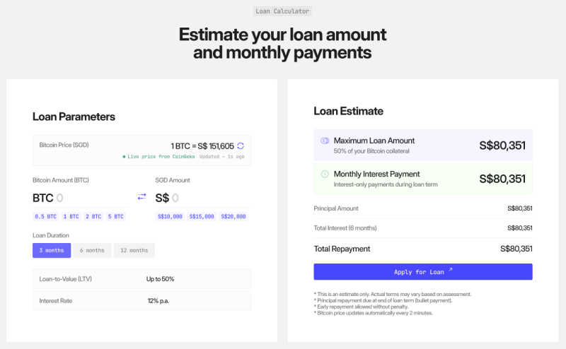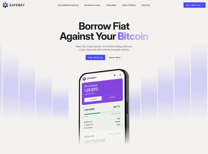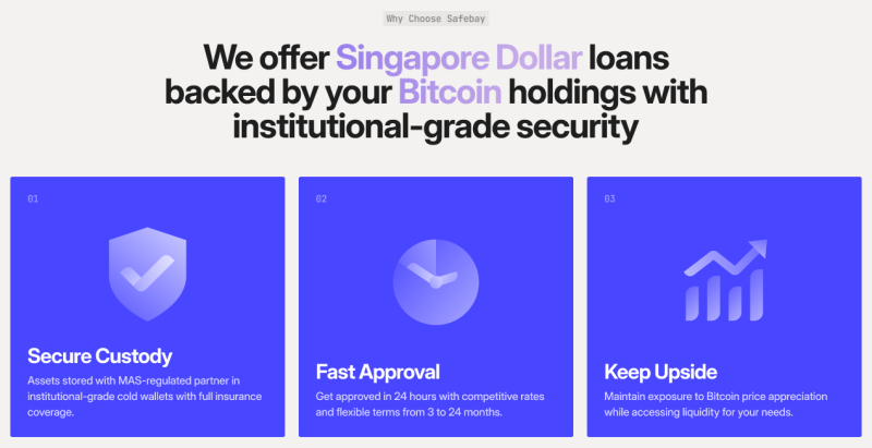 SafeBay offers up to 50% fiat loans against the value of Bitcoin for Accredited Investors and Businesses in Singapore. The service comes with clear rates starting at 12% annually, up to 12 months repayment period, and the option to repay at any time, allowing users to access SGD liquidity while retaining their Bitcoin.