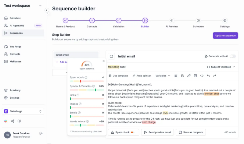 With its seamless integration of automation and human expertise, Salesforge allows teams to scale outreach efforts while maintaining the quality and personalization that make communication effective. Whether you're launching a new campaign or optimizing an existing strategy, Salesforge provides powerful tools to execute cold outreach with greater precision, adaptability, and success. This results in more opportunities, higher engagement, and ultimately, improved sales performance. Salesforge is designed to help businesses stay competitive in the evolving sales landscape while maximizing efficiency.