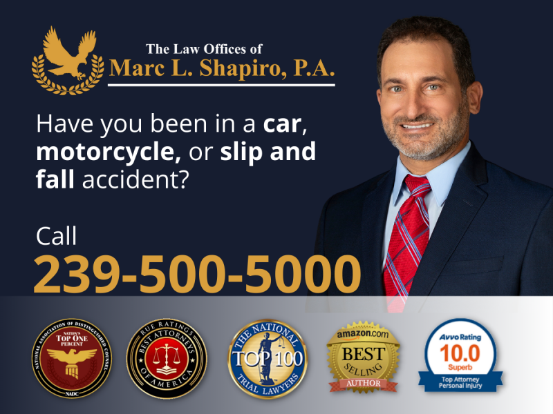 Marc L. Shapiro, Esq. is an award-winning personal injury attorney with over 30 years of experience. He serves Southwest Florida (Naples, Marco Island, Fort Myers, Estero & Cape Coral). Mr. Shapiro’s dedication to his practice and his clients is based on more than his decades of excellence as a personal injury attorney. Having personally dealt with the financial and emotional hurdles associated with unexpected medical issues in his family, Mr. Shapiro truly understands what his clients are going through after a traumatic accident. He takes personal pride in every case that comes to the firm and ensures that each and every client gets results-oriented, personalized advice and representation.