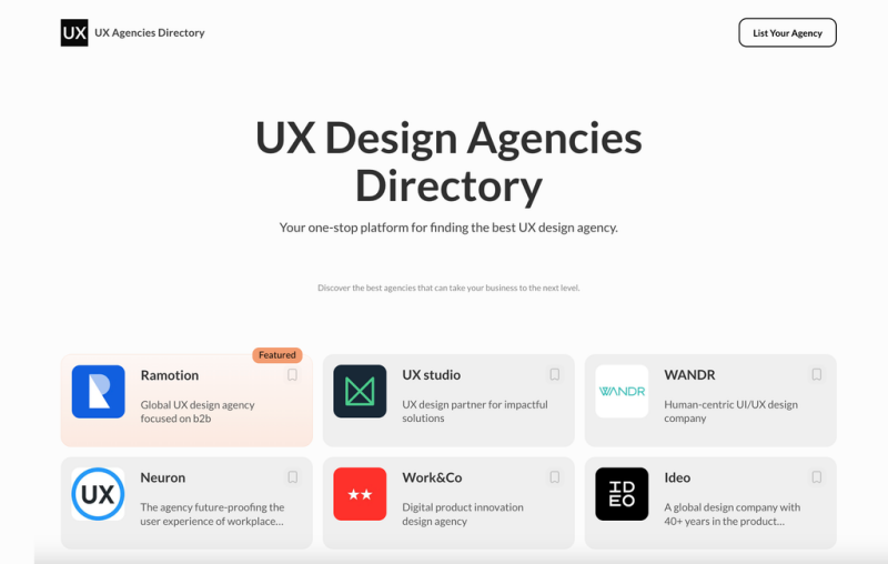Top UX Design Agencies is a comprehensive directory designed to help businesses find top-rated UX/UI design firms. The agencies featured on our platform specialize in designing user-centric digital solutions that prioritize usability and accessibility. Whether you're building a new product or improving an existing one, these agencies offer expert guidance and creative solutions. They are experienced in working with various industries, ensuring that each design is tailored to the unique needs of the business. Our platform allows businesses to easily browse and compare agencies, making it easier to find the right partner. The agencies we list are known for their innovative approach and attention to detail, ensuring high-quality digital experiences. Use our directory to discover top design agencies that can elevate your digital presence.