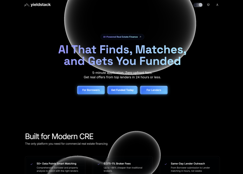 YieldStack is an AI-powered commercial real estate mortgage brokerage. Borrowers submit their deal once and get matched to 180+ lender programs across bridge, DSCR, multifamily, fix-and-flip, and hard money loans. 5-8 competing term sheets returned in hours. Zero upfront fees — 50-100 bps at closing only.