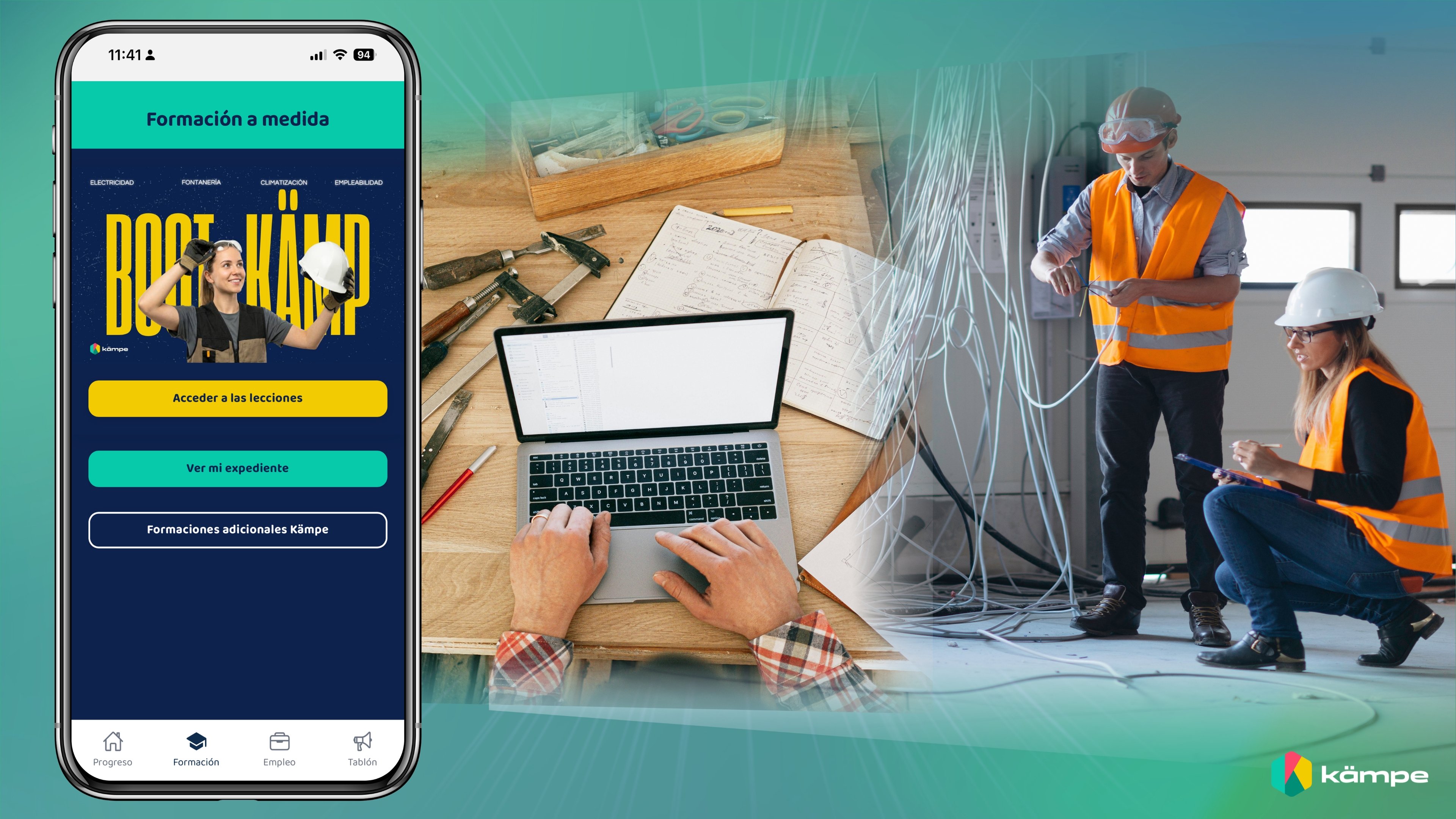 Kämpe es una plataforma digital que facilita el acceso y el crecimiento en oficios técnicos de alta demanda, como electricidad, fontanería o climatización. Combina programas formativos (bootcamps intensivos, certificaciones profesionales y cursos online) con una app donde cada usuario crea un perfil profesional verificable: un historial vivo de competencias validadas por coaches, evidencias multimedia de trabajos reales (fotos, vídeos), certificaciones oficiales e insignias de habilidades específicas.